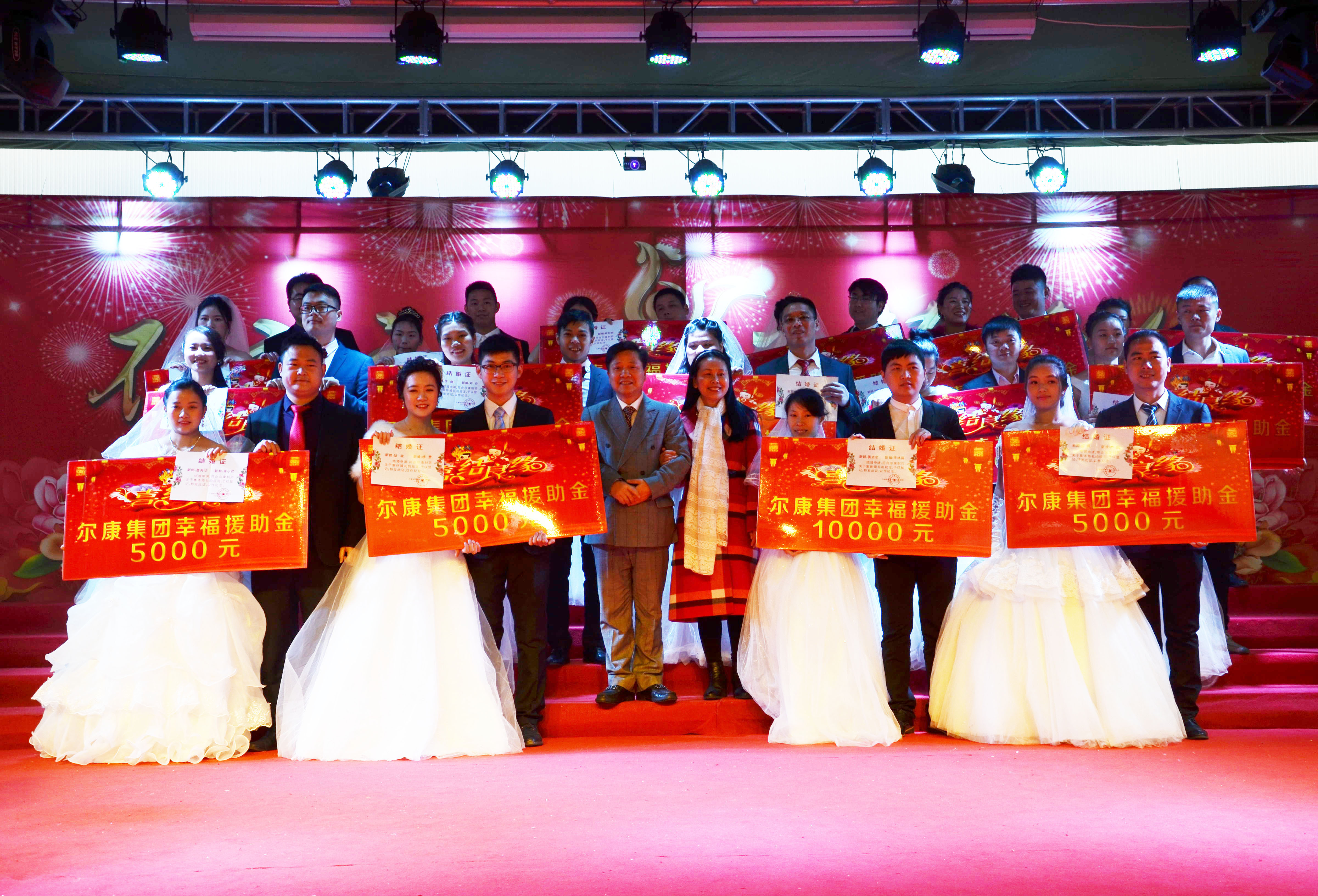 集体婚礼仪式中,15对新人携手走上舞台,尔康人共同见证,祝愿他们新婚愉快,幸福一生!尔康的集体婚礼活动至今已举办八届,旨在秉持造就富有员工理念,感恩所有支持尔康发展的尔康家人及其家属。